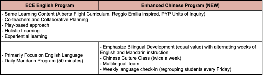 Starting in the 2025/26 school year, we will offer two options for our kindergarten program: the existing ECE English Program and the newly introduced Enhanced Chinese Program. The Enhanced Chinese Program will provide a dual-language immersion experience in both Chinese and English, beginning with Pre-Kindergarten (PK). This program is designed to enrich our early childhood education offerings by integrating Mandarin language immersion with the Reggio Emilia approach and the Alberta Flight Curriculum. Parents can refer to the table below for the instructional details of both programs.